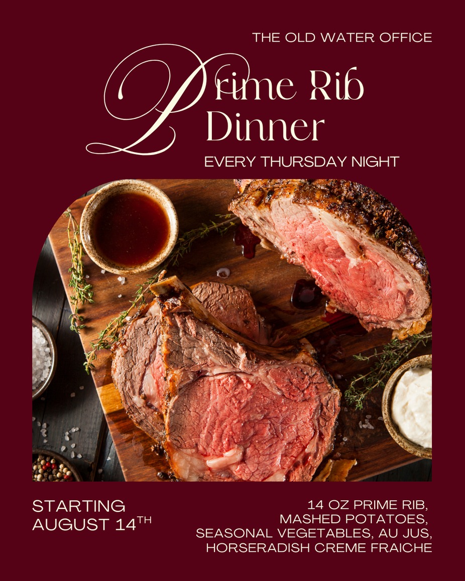 Every Thursday, we will be serving Prime Rib. Come and enjoy this weekly special paired with all the fixings. 14oz Prime Rib, seasonal vegetable, baked potato, au jus, and horseradish creme fraiche.